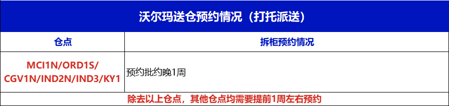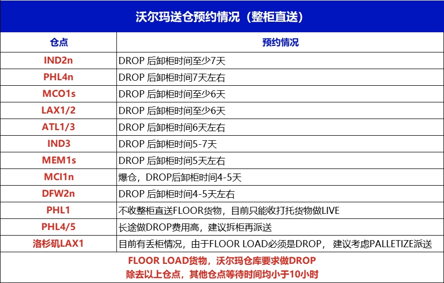 本周整柜直送新增了IND3仓点,需要DROP 后卸柜时间5-7天,沃尔玛热门仓整柜直送及打托派送的情况如下: