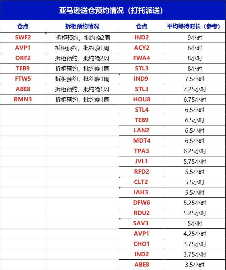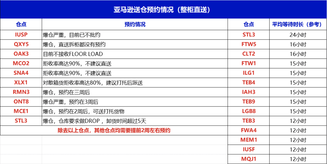 本周亚马逊整柜直送部分仓点爆仓程度有所好转,但IUSP、QXY5等多个仓爆仓严重STL3仓点等待时长依旧需要长达24小时。