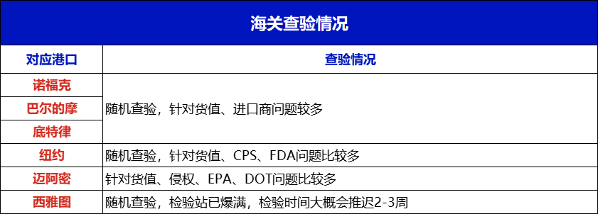全美大部分海关查验情况与上周变化不大,但近期关税变动大,建议卖家提前做好出货计划,及时关注市场变化。