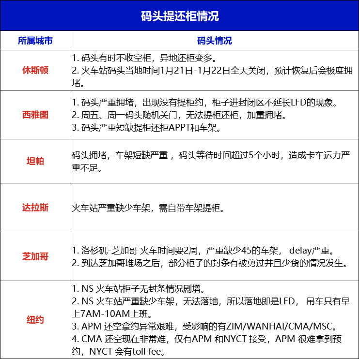 除了下面这些城市外,其余平均在4天左右,需要特别注意休斯顿火车站当地时间1月21日-1月22日将全天关闭,预计恢复后会极度拥堵。具体如下: