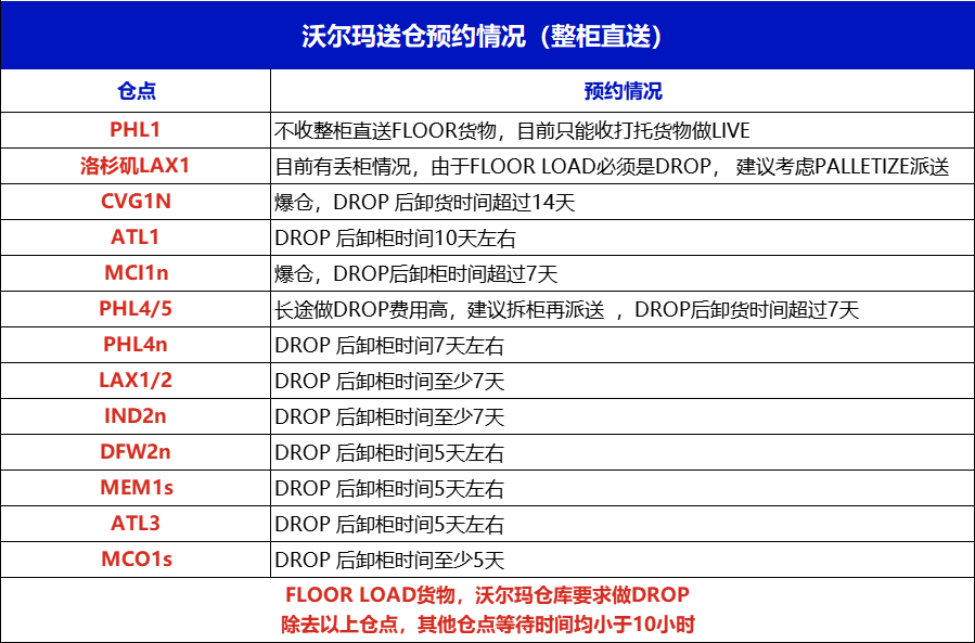 本周整柜直送情况爆仓情况加强,部分仓点如:PHL1、LAX1、CVG1N、ATL1均不推荐送仓,具体情况如下:
