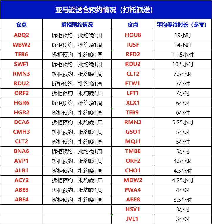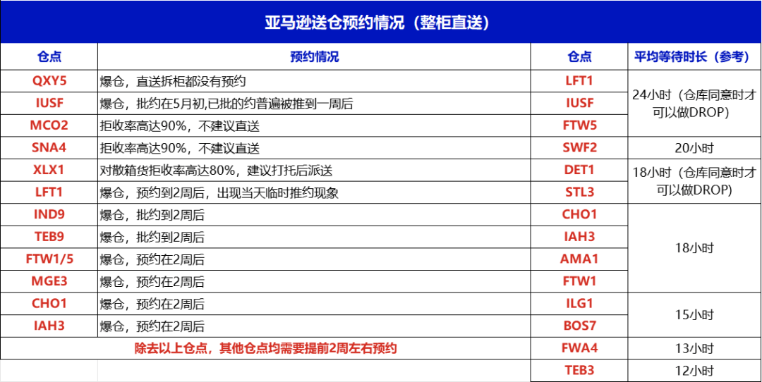 本周亚马逊整柜直送仓点爆仓情况非常严重,尤其是QXY5没有直送预约。与此同时,各大热门仓点即便送仓后,平均等待时长也非常长,还需要仓库同意才可以做DROP。