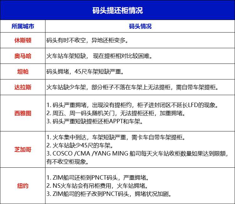 本周各大热门码头都存在拥堵情况,拖车架短缺,提还柜困难,近期如需发货的货主务必预留足够的时间。
