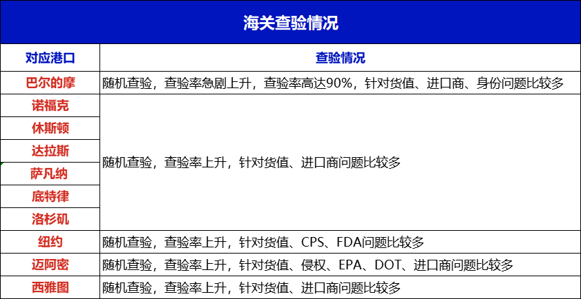 受关税变动影响,本周美国各港口的查验率急速上涨,且都是随机查验。货主出货时一定要注意申报金额和出货品名