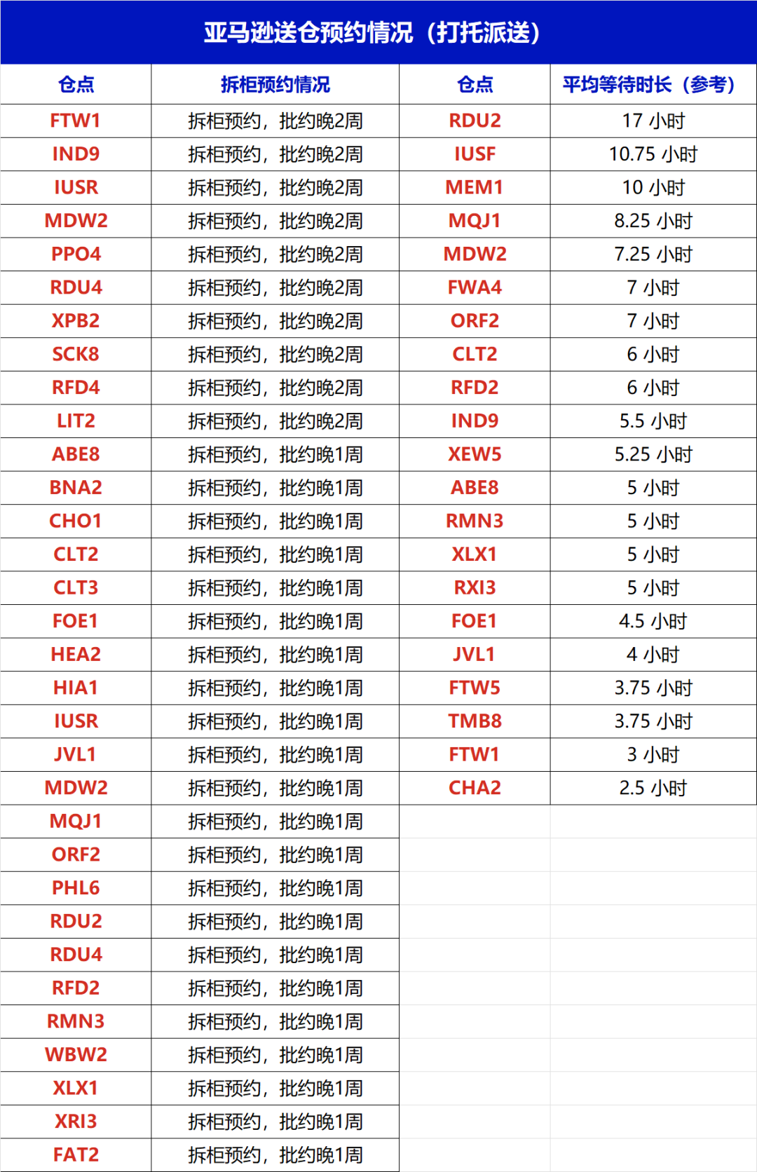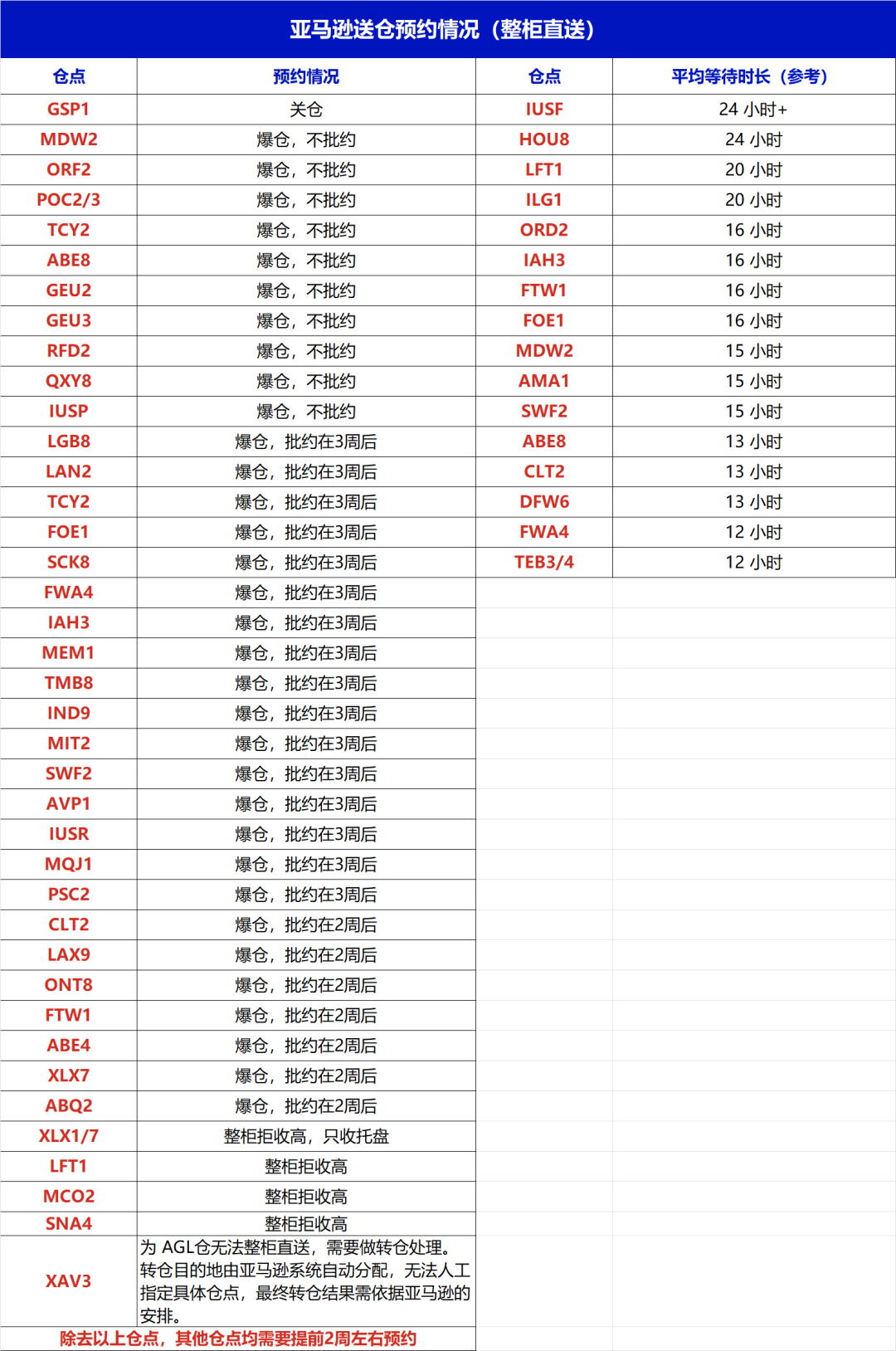 本周亚马逊整柜直送仓点等时明显增长,IUSF和HOU8仓点平均等待时长非常长,需要24小时以上。以下是亚马逊热门仓整柜直送的情况:
