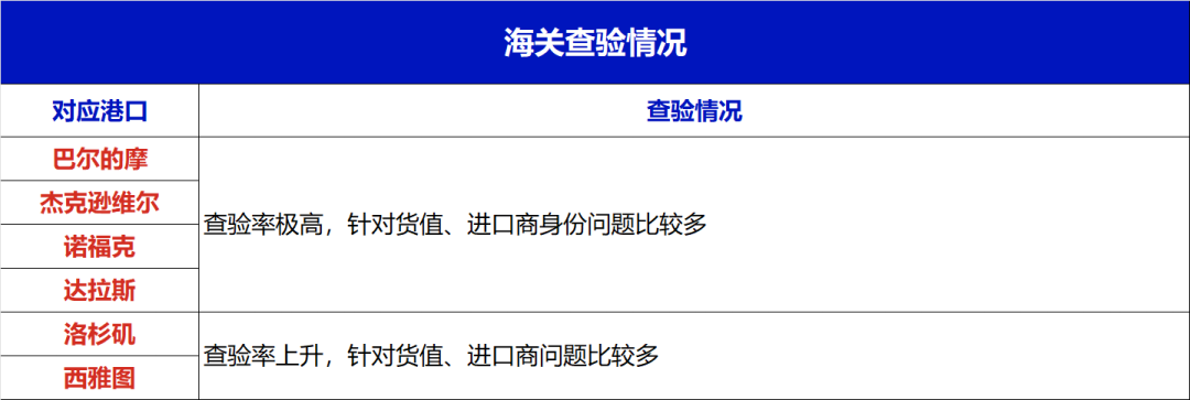 美国各港口的查验率依旧非常高涨,尤其是美东的几个港口,如巴尔的摩,杰克逊维尔,诺福克的查验率极高,具体情况如下: