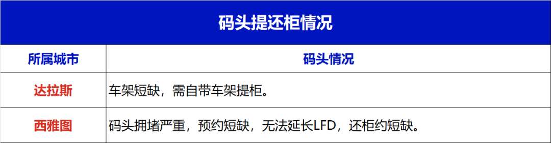 达拉斯码头拖车架短缺,西雅图码头拥堵严重,还柜约短缺,需要预留一定的时间,具体如下: