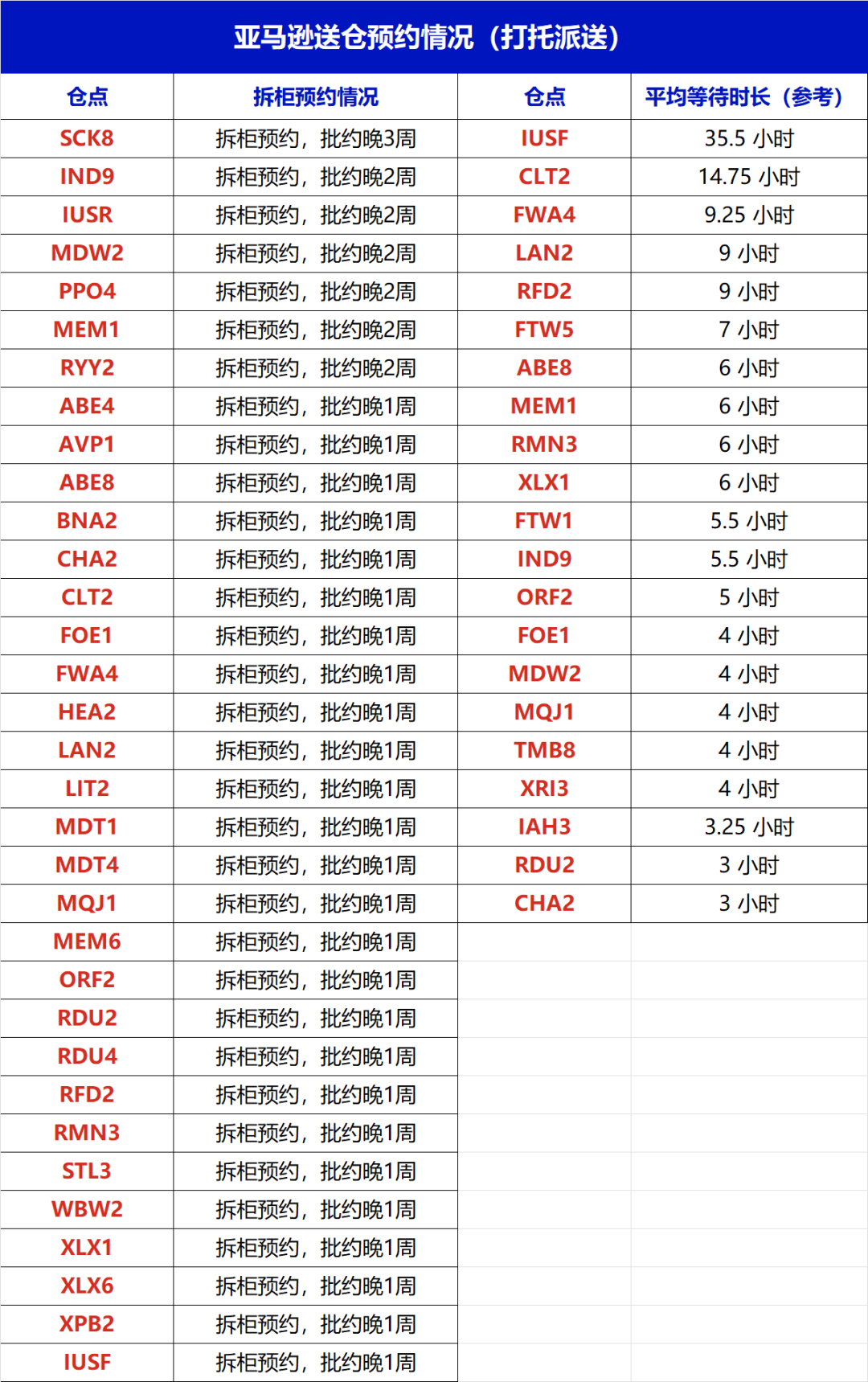 本周IUSF、CLT2仓点打托派送等待时间也很长,分别需要35.3和14.75小时,SCK8拆柜预约需要晚3周,具体情况如下: