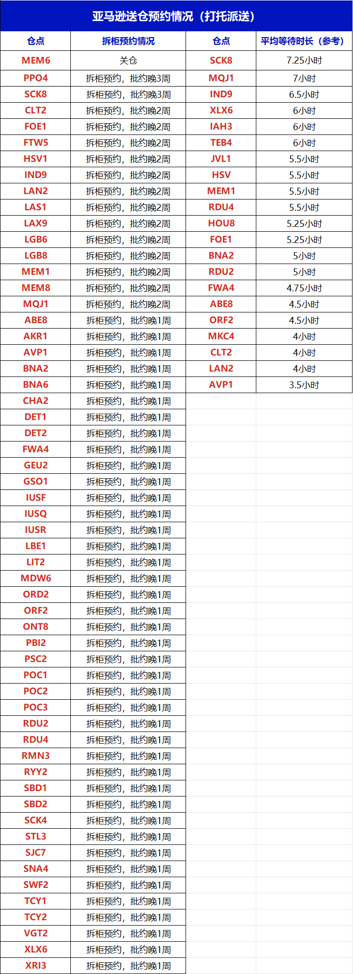 本周打托派送与上周整体差距不大,平均等待时长最长的是SCK8需要7.25小时,具体情况如下: