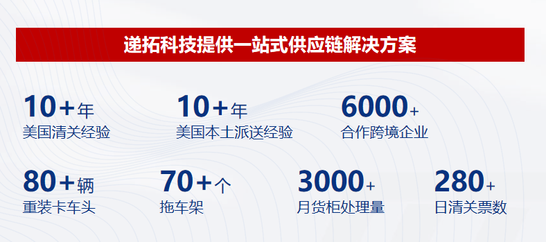 递拓科技成立于2014年,深耕美国市场多年,凭借专业高效的团队和优质服务,在美国清关、空海运、美国全境卡派、超大件到门等领域积累了丰富经验,形成了成熟业务体系,赢得6000+客户的认可。