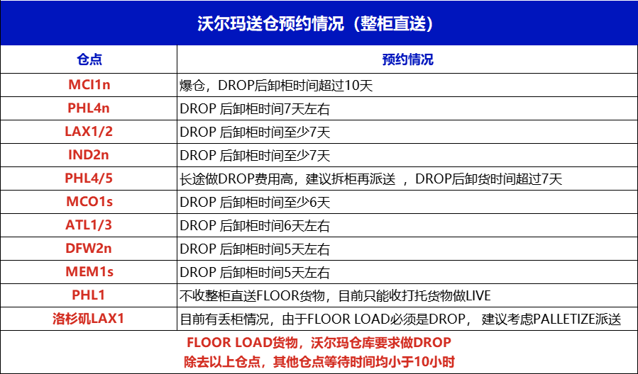 本周整柜直送情况与上周相比区别不大,MCI1n仓点爆仓,最长的卸柜时间将超过10天,具体情况如下: