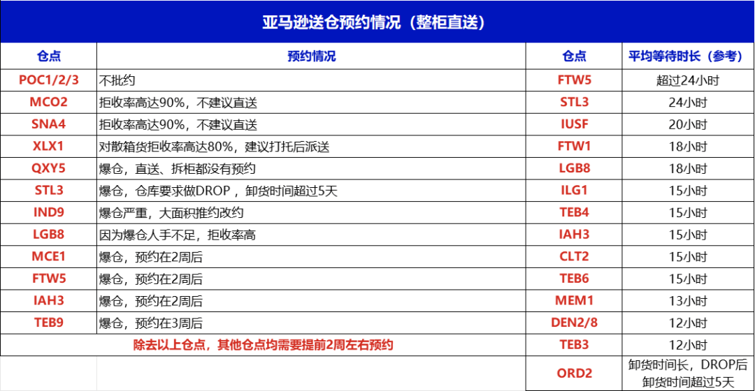 本周亚马逊整柜直送部分仓点等时和上周相差不大,但是个别仓点等时有所增长。如:ORD2、IUSF等仓点等待时长均有所延长。