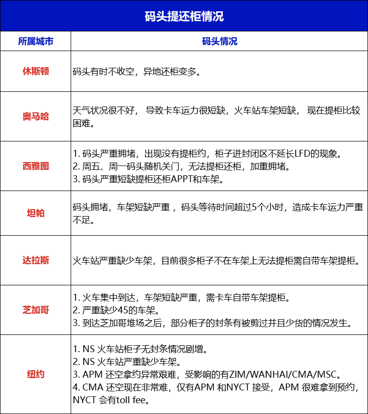 本周码头提还柜情况与上周相差不大,奥马哈天气状况依旧很不好,导致卡车运力很短缺,火车站车架短缺, 提柜比较困难,时效受影响。具体如下:
