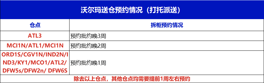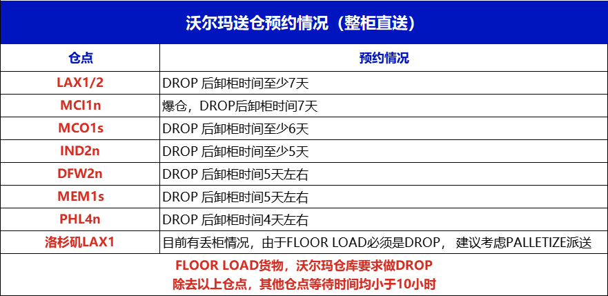 本周整柜直送LAX1/2仓点的预约时长有所缩短,但是其他的仓点,平均都多了一天左右。沃尔玛热门仓整柜直送及打托派送的情况如下:
