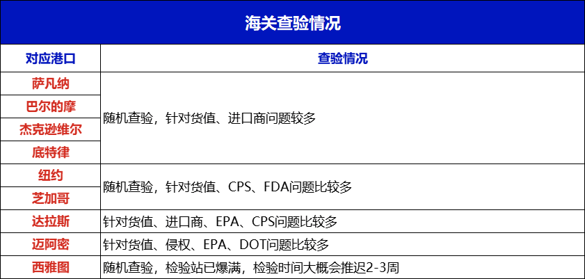全美查验情况相较于上周变化不大,需要注意的是西雅图港口,目前检验站已爆满,检验时间大概会推迟2-3周,具体情况如下: