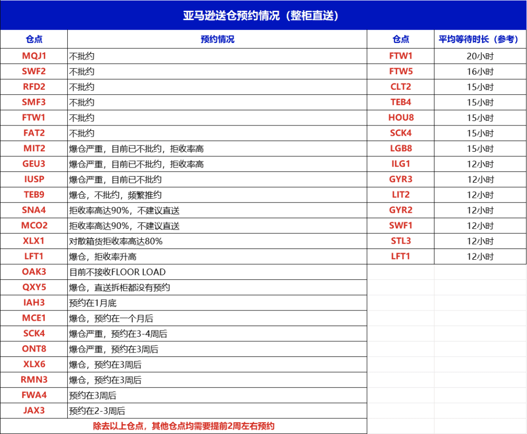 本周亚马逊送仓情况与上周相差不大,IAH3仓点爆仓更严重,从预约排到1月中旬改成了1月底,同时RMN3也出现爆仓情况,预约在3周后。各热门仓点等时已经相较于以往有所缩短。