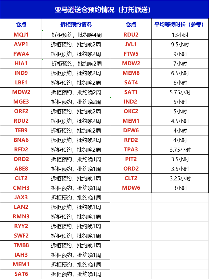 本周打托派送情况也比较严峻,MQJ1仓点最为严重,拆柜预约需要批约晚4周,其次等待批约周期较长的仓点有:AVP1、MQJ1、ORF2、RDU2、SWF2、TEB9。具体情况如下: