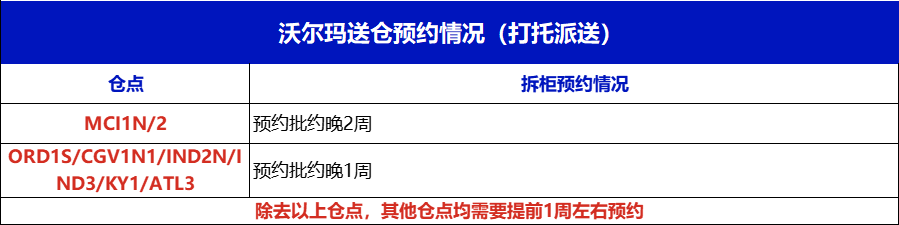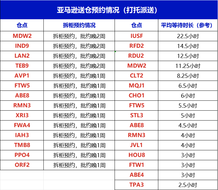 本周打托派送情况也有开始拥堵,像MDW2、IND9、LAN2、TEB9拆柜预约,批约晚2周,具体情况如下: