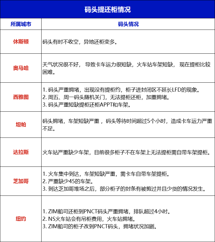 本周纽约码头提还柜情况很不理想,ZIM船司还柜到PNCT码头严重拥堵,排队超过4小时;ZIM船司的柜子改到PNCT码头,拥堵状况加剧;NS火车站也会有吊柜费用,火车站拥堵具体如下: