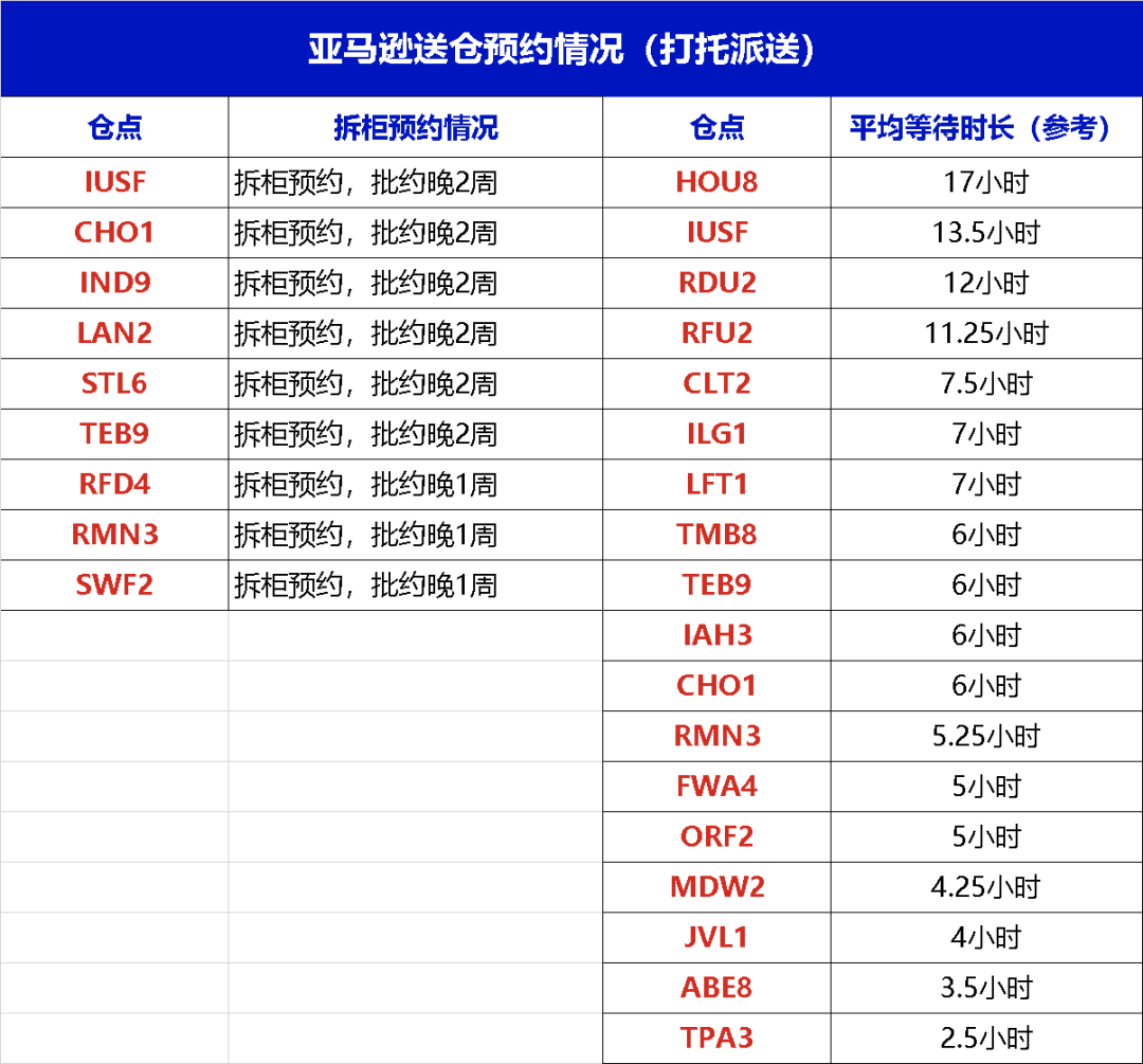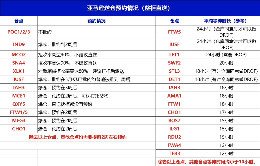 本周亚马逊整柜直送仓点等待时长明显增长,有10个仓点的等时超过15小时,具体情况如下: