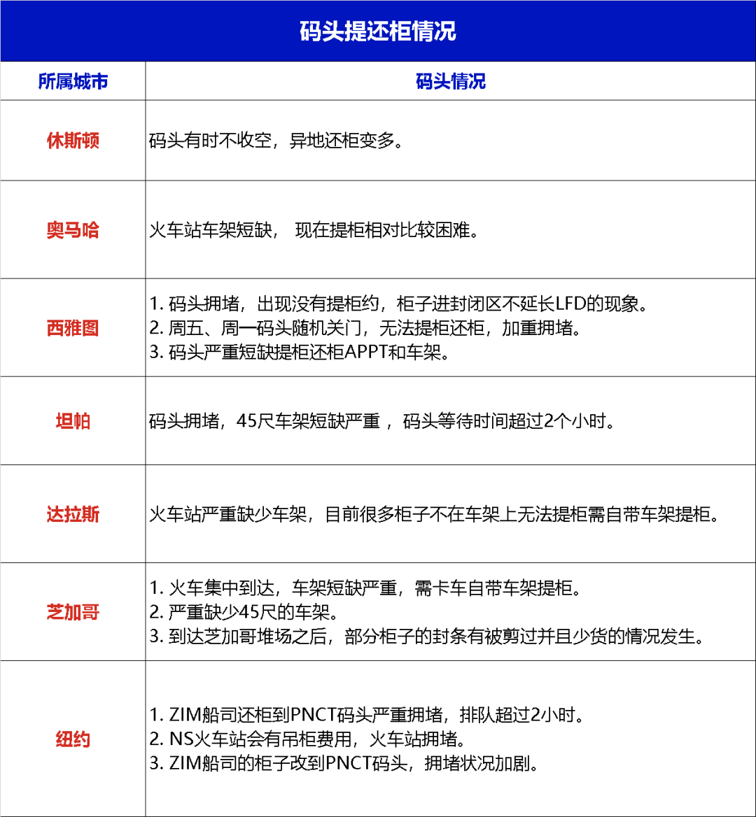 本周码头提还柜情况与上周区别不大,坦帕码头的待时间从5小时缩短至2小时,奥马哈受早期的天气影响,提柜依旧困难
