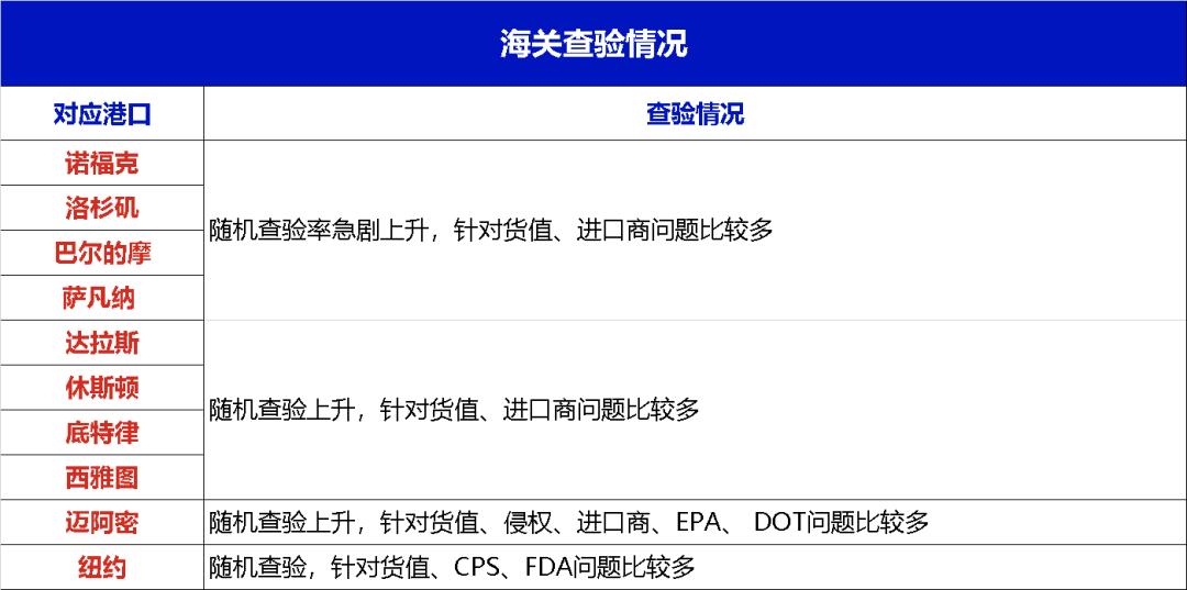 受关税变动影响,本周美国各港口的查验情况并没有得到明显的好转,查验率依旧处于上涨阶段,请货主们留意出货情况。