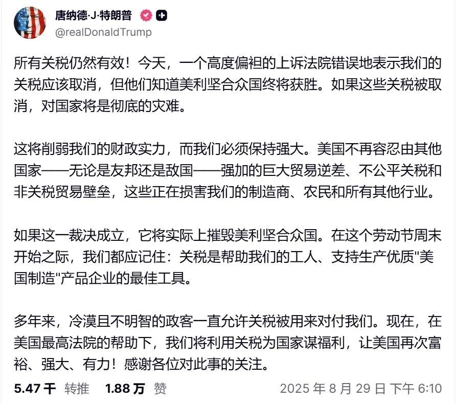 在此期间,巡回法院暗示:若要援引IEEPA征税,其范围必须远小于特朗普的实际做法。目前该裁决将暂缓执行至10月14日,以便特朗普政府有时间向最高法院提起上诉。