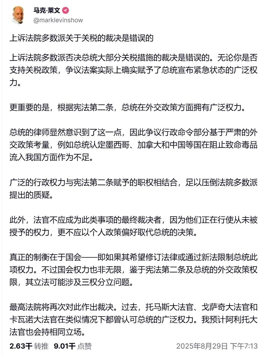 美国著名的电台脱口秀节目主持人兼政治评论家也表示:“上诉法院多数派关于关税的裁决是错误的。”