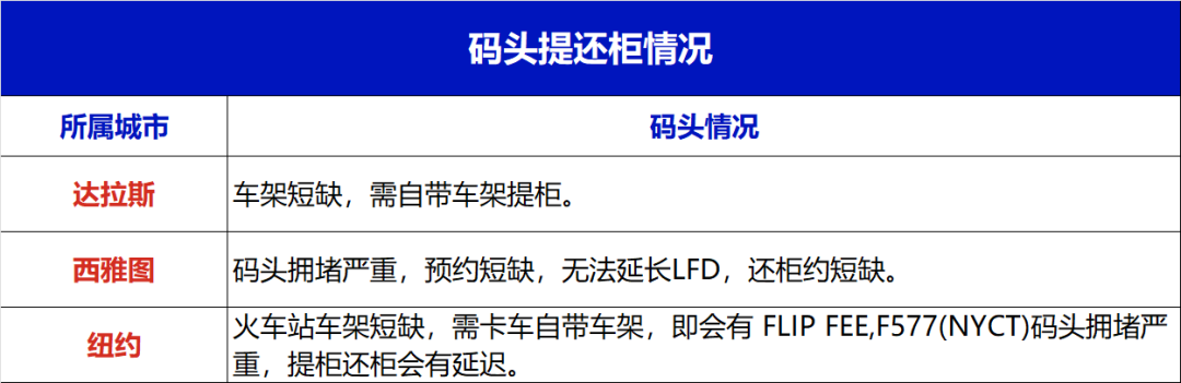 目前达拉斯、西雅图和纽约码头提还柜情况依旧比较严峻,具体如下: