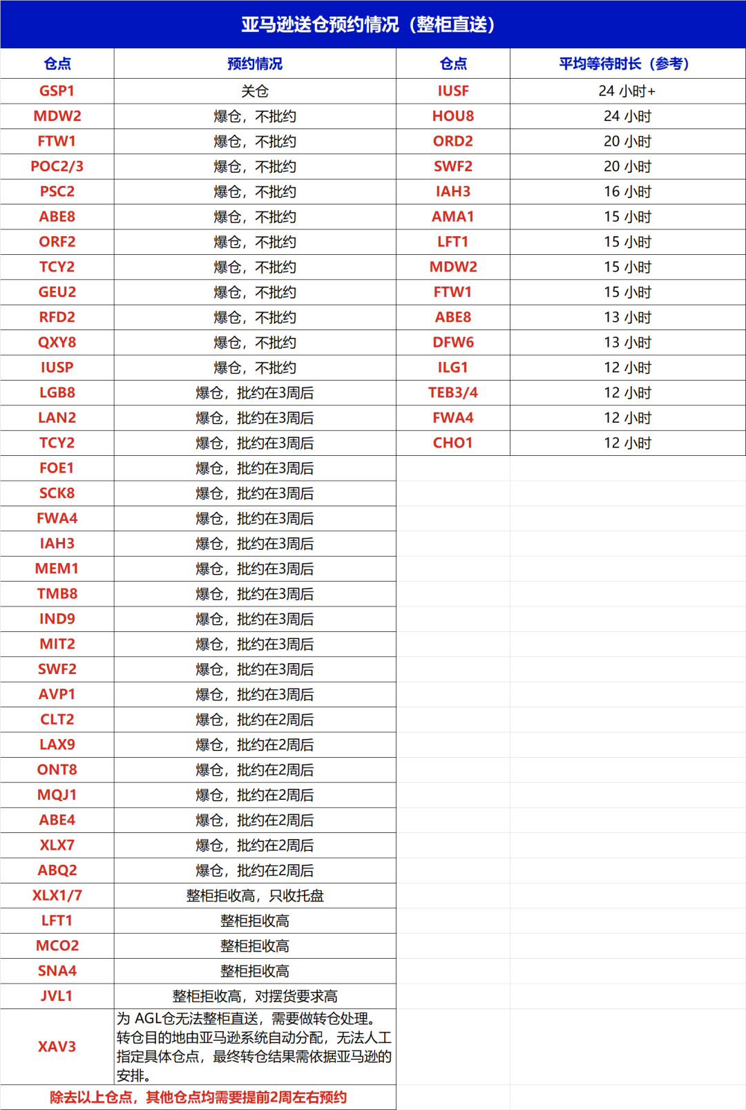 亚马逊整柜直送仓库爆仓依旧很严重,多个仓库爆仓不批约,大多数仓库都需要提前3周预约,IUSF等待时长超过24小时具体情况如下: