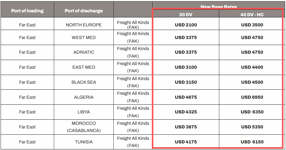MSC:将所有从远东港口到北欧、地中海以及黑海港口的运费调整如下:
