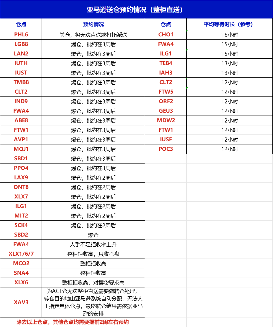 本周亚马逊大部分整柜直送仓点平均等待时长在12-13小时左右,部分仓点会稍微长一些,具体情况如下: