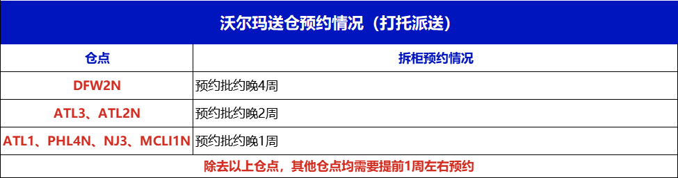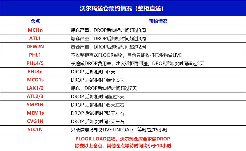 本周沃尔玛送仓预约打托派送,MCI1n、ATL1仓点爆仓严重,卸柜超过3周,需要特别注意,具体情况如下: