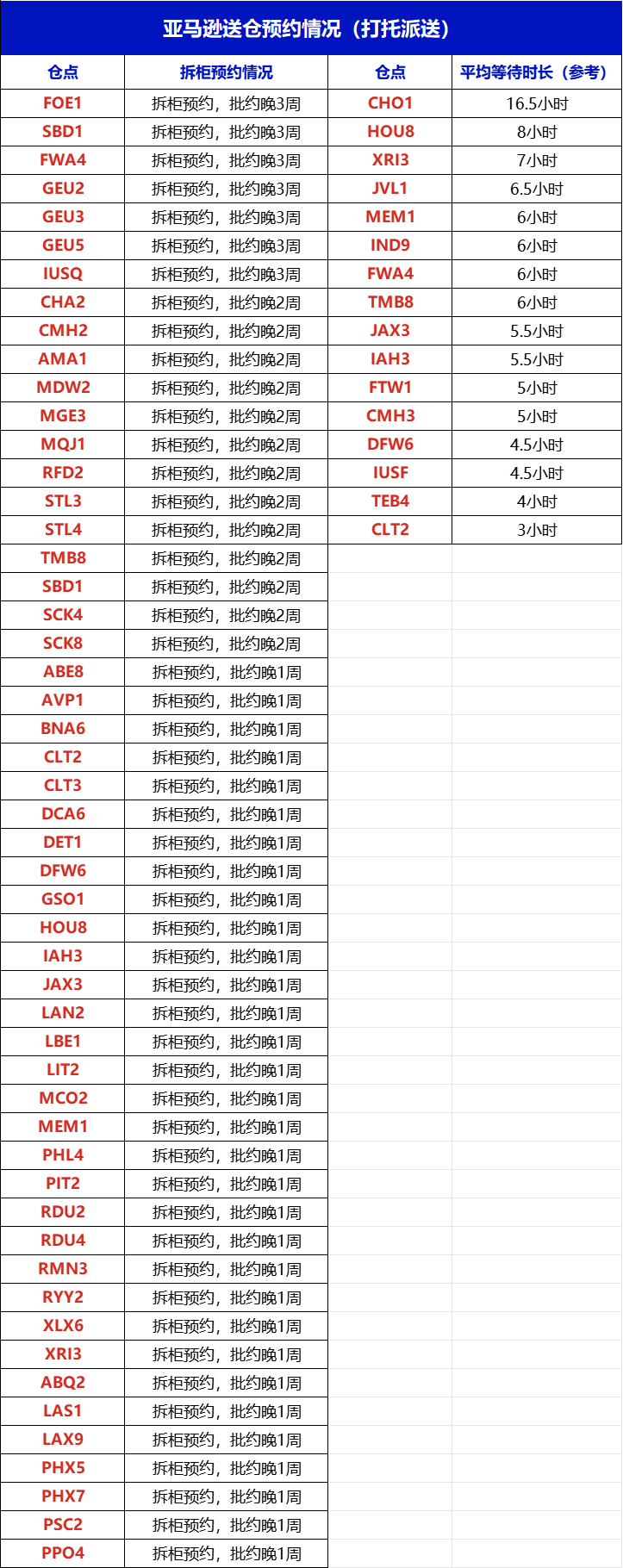 本周亚马逊拆柜预约,批约晚3周的仓库明显增加,分别有:FOE1、SBD1、FWA4、GEU2、GEU3、GEU5、IUSQ,具体情况如下: